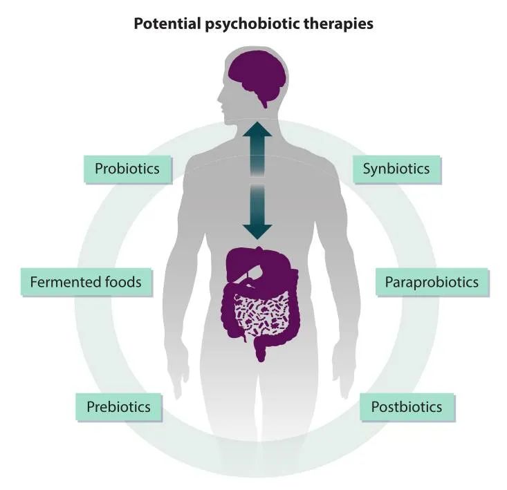 考虑到肠道菌群在这些大脑相关疾病中发挥作用的新证据,那么通过改变肠道菌群靶向介导大脑的手段就不足为奇了。“精神生物质”一词由Dinan等人于2013年提出,是一类新型精神药物,被定义为“当摄入足量时,对精神疾病患者产生健康获益的活生物体”。此后,该定义被扩展至包括“对大脑的影响是细菌介导的任何外源性影响”。因此,心理生物制剂可以包括一系列影响微生物肠脑轴信号的物质,包括益生菌、益生元、合生元和后生元(图2)。这些物质可以通过补充剂、功能性食物和改善饮食摄入来提供。