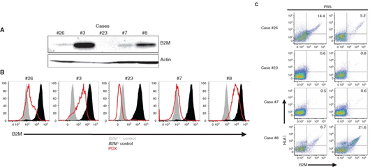 图5 β2M基因缺失后ICI耐药性肿瘤中HLA-I类抗原加工和呈递的缺陷。A. Western blot分析#23没有β2M蛋白表达,β2M蛋白在其他肿瘤患者PDX中有表达(# 26, 3, 7, 和8);B. 流式细胞术分析结果与A吻合;C. HLA-I类分子与β2M数量呈正相关