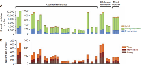 图2 患者样本ICIs获得性耐药的突变景观。A.体细胞突变负荷;B.肿瘤新抗原负荷