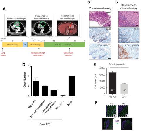 图4 免疫治疗获得性耐药#23患者β2M基因缺失。A.影像学变化及治疗之间轴;B/C.耐药前后肿瘤组织病理切片;D.荧光定量PCR β2M基因拷贝数变化;E.和F. 免疫荧光耐药前后肿瘤组织内β2M蛋白定性及定量分析