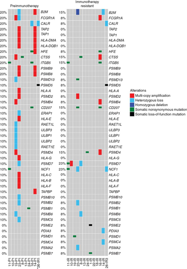 在黑色素瘤和结直肠癌对派姆单抗耐药的病例中发现HLA-I类抗原的处理和提呈存在缺陷。为确定患者样本队列中是否存在编码HLA-Ⅰ类分子APM机制的基因遗传缺陷,作者调查了72个与抗原处理和提呈相关基因(http://www.genome.jp/dbget-bin/www_bget?hsa04612)。基因拷贝数变异分析显示,ICI耐药样本中具有获得性突变的基因:PSMD13、CD207、PSMD4、PSMD7和PSMD1,但未发现这一途径中基因的反复突变和/或拷贝数改变;ICI耐药样本#23存在β2M最初是杂合子丢失,耐药后出现β2M纯合子丢失(图3)。