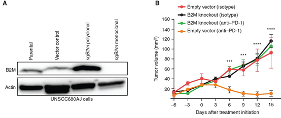 图6 β2M表达缺失会导致PD-1抑制剂治疗耐药。Western blot分析β2M敲除的小鼠肺癌细胞;B.比较抗PD-1治疗的β2M野生型和β2M敲除株系在小鼠体内同一时间点瘤体体积