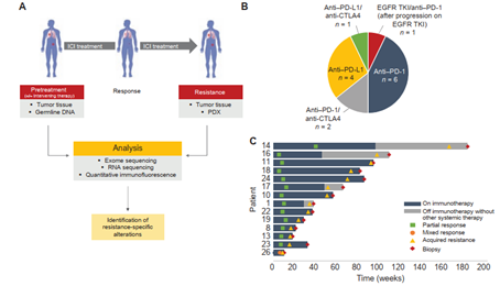 图1 获得性耐药ICIs病例分析过程特点。A.14例入组患者重复活检及样本分析示意图;B.不同患者的免疫治疗方案;C.单个病人对免疫治疗的应答时间,对ICIs的耐药和治疗时间点
