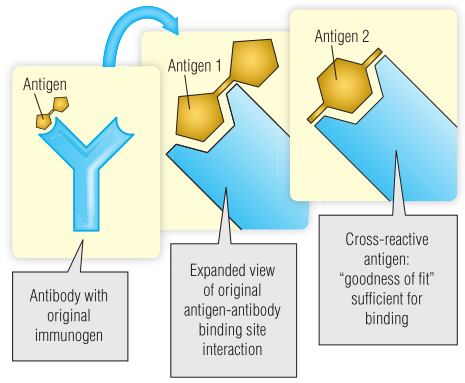 一种抗体偶尔会与一种以上的抗原结合,这称为交叉反应或多特异性。该抗体是抗原1的特异性抗体,但与另一个分子抗原2,足以产生稳定的结合作用(Fig 5.2)。交叉反应的发生是因为抗原和抗体之间存在足够数量的化学相互作用,以创建一个稳定的结构,而不考虑总的“拟合优度”。值得注意的是,交叉反应可能会产生临床后果(BOX 5.1)。