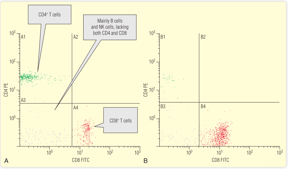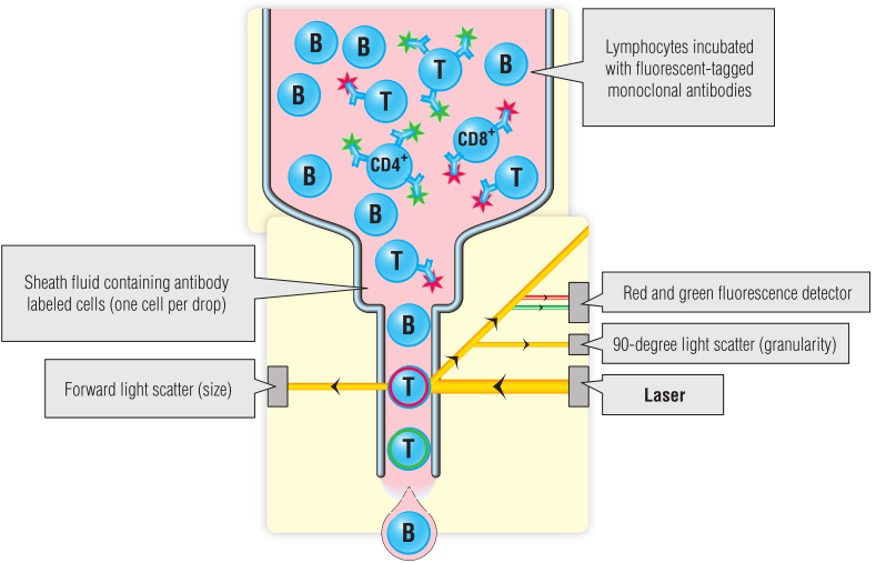 流式细胞术是一种用计数表达抗原的细胞的技术。这些细胞被细胞表面抗原特异性抗体染色。抗体被偶联到特定的荧光试剂,如FITC(还有其他几种不同颜色的荧光可供选择),然后通过流式细胞仪。染色细胞的数量可以计数,例如CD4+T细胞的数量(Fig 5.7;另一个例子见第35章)。
