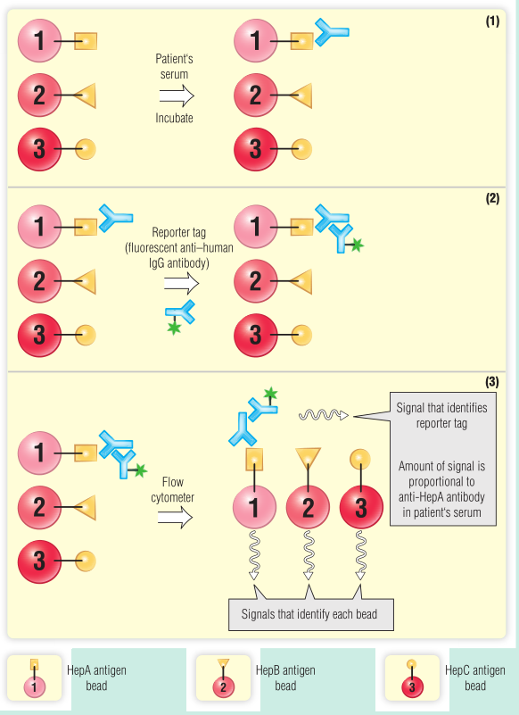下面是可以使用该测试的一个示例。一个病人在出国旅行后不久就出现了黄疸。病人声称在旅行期间没有高危行为史,然后他被要求检测肝炎病毒抗体。采集血液样本,血清用于检测甲型、乙型和丙型肝炎病毒抗体的存在。如图所示,患者血清中含有与表达甲型肝炎抗原的Luminex小球结合的抗体,而不是与表达乙型肝炎或丙型肝炎抗原的小球结合的抗体。患者接受甲型肝炎治疗,黄疸消退。