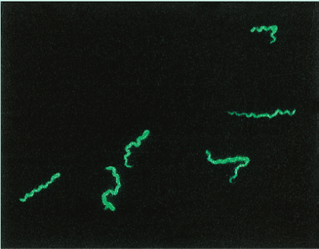 梅毒螺旋体引起梅毒。这种细菌是一种柔韧的螺旋杆(Fig 5.10)。为了获得如图所示的图像,进行了荧光梅毒抗体吸收试验(FTA-ABS)。试验血清首先被非致病性梅毒螺旋体吸收,以去除交叉反应抗体。然后,将吸收的试验血清与梅毒螺旋体在显微镜载玻片上反应,根据Fig 5.6中描述的间接免疫荧光法,在荧光显微镜下用异硫氰酸荧光素(FITC)偶联的抗人免疫球蛋白G(IgG)抗体检测任何与梅毒螺旋体结合的抗体。