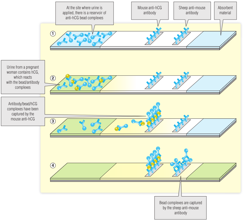 验孕棒是由一种具有吸收性的纸质材料制成的。放置在试棒一端的尿样将通过毛细管作用被吸引,并在沿试条的过程中遇到不同的试剂(Fig 5.4)。第一种试剂是与抗hCG表位的彩色微珠相连的小鼠抗体,当尿液第一次滴在验孕棒上时与之混合,如果有hCG存在,尿液就成为hCG-抗体-微珠复合物的一部分。虽然这些都是分散的,但这些复合体仍然是看不见的,并继续沿验孕棒流动。