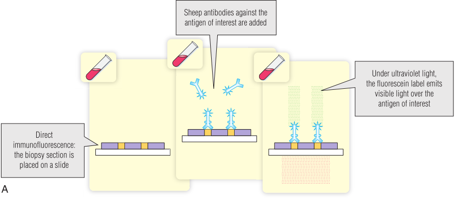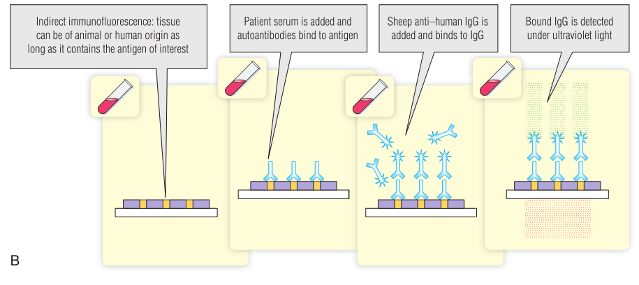 免疫荧光使用的是荧光化合物(荧光素)共价连接的抗体。免疫学家广泛使用的一种荧光化合物是异硫氰酸荧光素(FITC),它与蛋白质上的游离氨基偶联。当FITC暴露在紫外线(UV)下时会发出绿色光。安装紫外线光源的荧光显微镜被用来检查暴露在荧光抗体中的样本。这项检测广泛用于检测细胞或组织切片中的抗原。它还用于筛选细胞或组织抗原的自身抗体(第28章)。要么测试抗体直接连接到荧光化合物(直接检测),要么可以识别抗体的配体连接到荧光化合物(间接检测;Fig 5.6)。通常,荧光配体是针对检测抗体(如山羊抗人免疫球蛋白)所特有的第二种抗体。BOX 5.2提供了间接免疫荧光分析的临床应用实例。