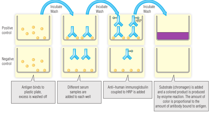 酶联免疫吸附试验(ELISA)是一种非常敏感和简单的检测,它使用与抗体相连的酶的共价复合物直接检测抗原或与抗体-抗原复合物结合(Fig 5.3)。这项实验使用的是塑料板,将相关抗原绑定在“孔”的内部。患者血清在这些孔中孵育,任何相关抗体随后都会与抗原结合。对含有无关抗体的血清进行清洗,但由于其高亲和力,与抗原结合的抗体不会受到干扰。最后,加入从动物中提取的能与酶结合的第二种抗体,将其与患者抗体结合。这种抗人免疫球蛋白将与孔中仍然存在的抗体结合。所选的酶能够催化反应,从无色底物(如碱性磷酸酶或辣根过氧化物酶[HRP];见Fig 5.3)生成有色产物。然后,与抗原结合的抗体的量与可以看到的有色最终产物的量成正比。BOX 5.2显示了如何使用ELISA来筛查传染病。