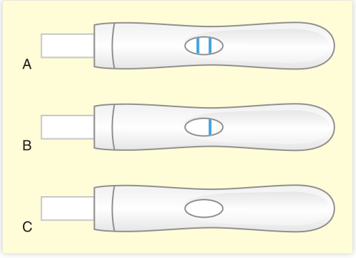 Fig 5.5 A、双线阳性妊娠试验;B、单行阴性试验;C、测试失败,无线