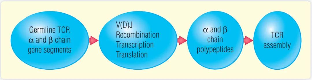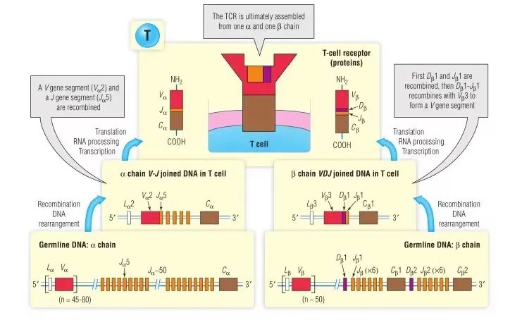 本章介绍T细胞的抗原识别分子,即T细胞受体(TCR)。上图概述了TCR组装的主要步骤。如第2章所述,TCRs识别肽抗原有一个必要条件,那就是该抗原需要由自身主要组织相容性复合物(MHC)分子进行展示,没有与MHC结合的抗原是不能被TCR识别的,也就是说,它们具有双重特异性。这与B细胞抗原识别分子(抗体)不同,抗体是直接结合各种肽和非肽抗原。