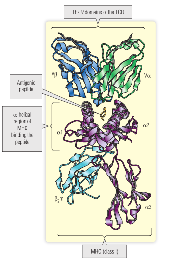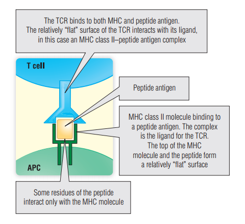 对TCR-肽-MHC复合物进行了3-D结构分析。Fig 7.6显示了MHC I类分子(HLA-A2),病毒肽和特异性TCR,该TCR V区的高变序列产生一个“平坦”的表面,该表面与抗原肽的残基以及位于MHC分子α1和α2域中的一些多态氨基酸残基相互作用。
