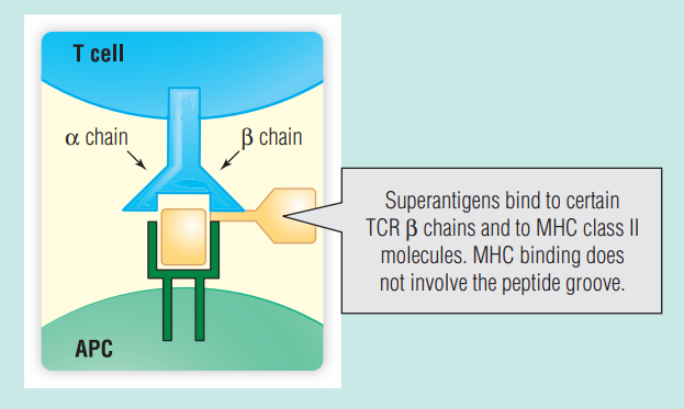 某些细菌和病毒产生的某些蛋白质无需加工即可被表达αβ T细胞受体(TCRs)的T细胞识别。它们直接(但在抗原识别位点之外)与许多TCR Vβ序列结合激活T细胞。它们还与MHC II类分子的外表面结合(Fig 7.9)。由于它们与许多T细胞的TCR Vβ区的结合,超抗原能够激活1%-20%的T细胞,并导致血液中存在高水平的细胞因子。高水平的细胞因子被称为细胞因子风暴,会导致以中毒性休克综合症为特征的低血压和多器官衰竭。请注意局部感染(在这种情况下为受感染的棉条)引起威胁生命的症状。感染性休克是引起细胞因子风暴和血压降低的另一个原因(第21章)。在感染性休克的情况下,感染通常很普遍,血培养通常是阳性。