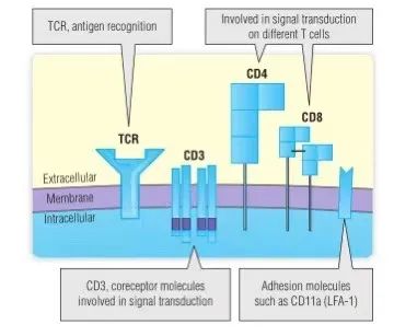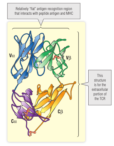 TCR是异二聚体膜蛋白。TCR包括两种类型的受体,分别是αβ链受体和γδ链受体,携带有两种受体的T淋巴细胞的比例分别约占人类总T淋巴细胞的95%和5%。这些受体中的每一个链的分子量都在40,000至60,000之间。每条链的细胞外部分由两个域组成(见Fig 7.1)。整体结构类似于免疫球蛋白(Ig)的抗原结合片段(Fab)的结构。距膜最远的TCR域与Ig可变(V)区域相似,而距膜最近的TCR域与Ig恒定(C)区域相似。抗原结合由αβ或γδ链的V结构域产生的位点进行。已经确定TCR细胞外部分的三维(3-D)结构(Fig 7.2),与Ig具有很大相似性。