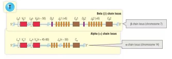 编码TCR链的基因片段的结构非常类似于Ig重链和轻链基因区段的结构。如Fig 7.3所示,α和γ链的基因与Ig κ和λ轻链的基因类似,因为它们仅使用V和J段。β和δ链的基因类似于Ig重链基因,它们使用V,D和J基因段。与Ig基因的不同之处在于,TCR C区域基因较少。例如,只有一个Cα基因,有两个Cβ基因,但它们在功能上似乎是相同的。这与其中C区包括µ,δ,γ,ε和α类以及λ亚型(λ1至λ4)等的Igs相反。