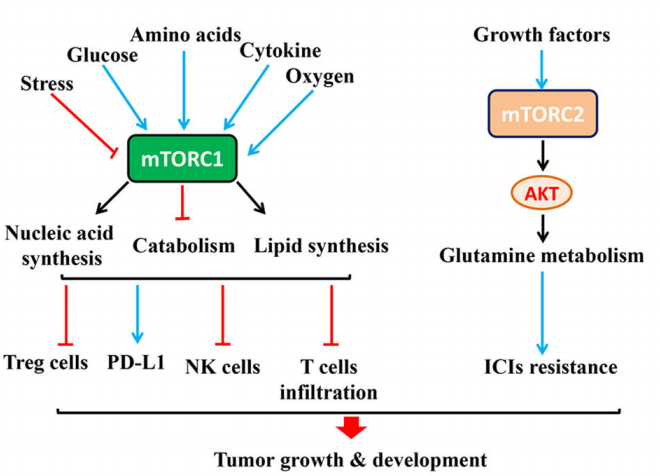肿瘤细胞的mTOR信号通路通过影响肿瘤免疫促进肿瘤的发生和发展。例如,mTORC1能促进PD-L1的表达,抑制Treg细胞、NK细胞和T细胞的浸润,从而使肿瘤细胞逃避免疫细胞的杀伤。对黑色素瘤的研究发现,肿瘤细胞分泌抑制性细胞因子,减少T细胞向肿瘤微环境的浸润,使肿瘤细胞在mTORC2诱导的AKT活化后对免疫检查点抑制剂产生抵抗。