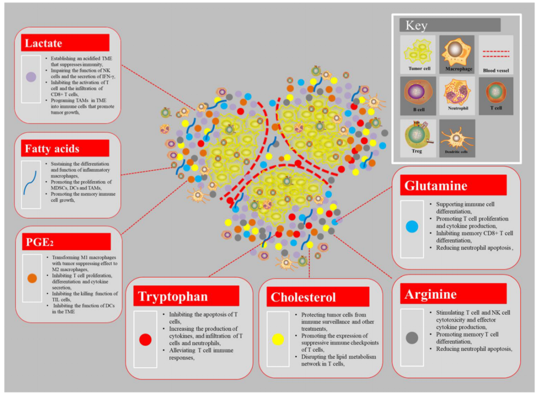 除了营养消耗外,肿瘤细胞产生的代谢物也会对微环境中的免疫细胞产生深远影响。