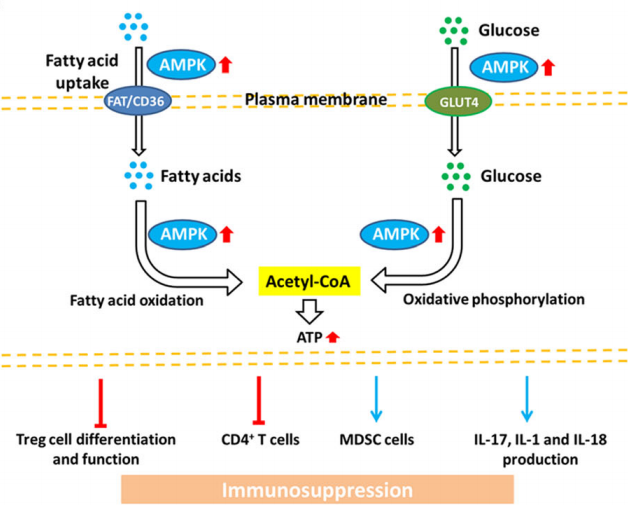 AMPK是调节细胞能量稳态的关键分子,这种激酶的激活是对细胞内ATP消耗的应激反应,如低血糖、缺氧、缺血和热休克。AMPK负调控ATP消耗生物合成过程,包括糖异生、脂质和蛋白质合成。有趣的是,AMPK激活与免疫信号通路协同调节细胞免疫,并控制能量代谢,从而影响免疫细胞的激活。