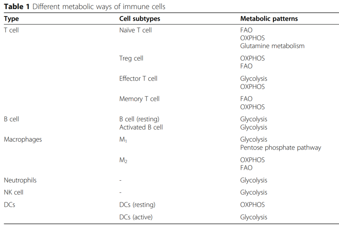 此外,活化的中性粒细胞、M1巨噬细胞、iNOS表达的树突状细胞(DC)主要依靠糖酵解提供能量。调节性T细胞(Treg)、M2巨噬细胞主要依靠脂肪酸氧化(FAO)产生的氧化磷酸化来提供能量。不同的代谢模式也影响不同免疫细胞亚群的分化。
