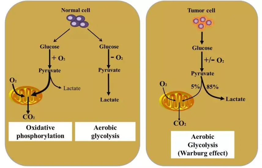 事实上,肿瘤细胞主要利用糖酵解途径快速提供ATP供自身生长,也通过磷酸戊糖途径(PPP)和丝氨酸代谢途径为细胞复制提供生物大分子。即使在充足的氧气条件下,肿瘤细胞仍优先利用糖酵解产生ATP,这是众所周知的有氧糖酵解(Warburg效应)。