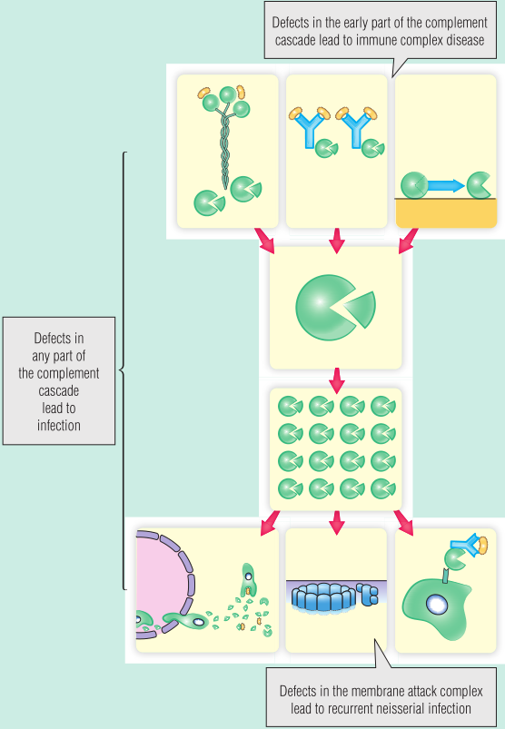 补体成分的缺乏会导致反复的细菌感染,部分原因是补体缺乏导致调理作用减弱,使细菌不能有效被吞噬,另外一部分原因是补体参与启动的抗体产生减少(Fig 20.14)。膜攻击分子(MAC)的缺失会导致感染奈瑟氏菌的风险更高,就像本例中的情况一样。目前尚不清楚为什么MAC缺陷的人感染奈瑟氏菌的可能性是普通人群的几千倍。