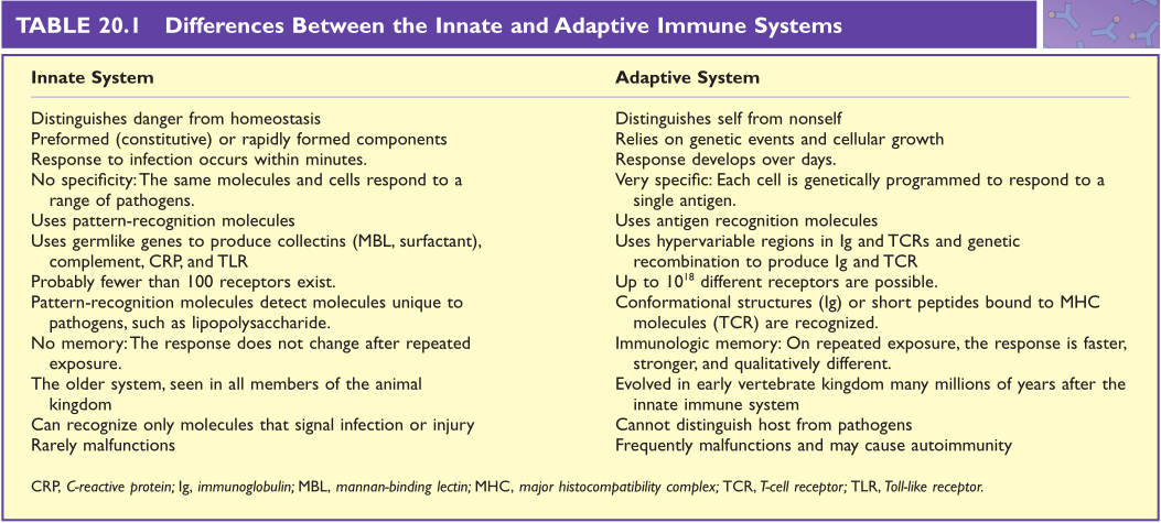 Table 20.1 先天免疫系统与获得性免疫系统的差异