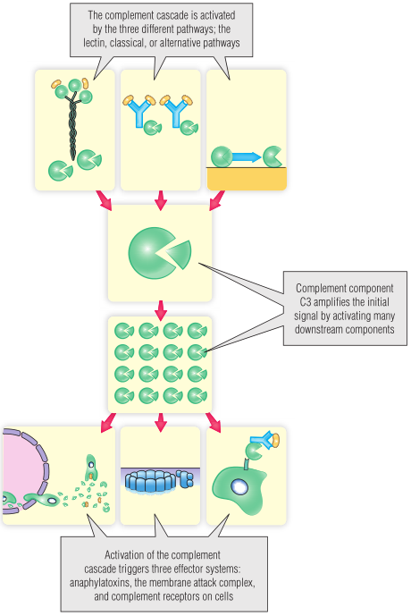尽管补体成分数量较多,但整个系统是简单易懂的。九个基本补体成分编号为C1-C9。当它们被激活时,补体被分为大片段和小片段。这些小片段称为C3a,C4a等。补体根据病原体种类的不同会有三种激活途径,三种途径都会激活关键成分C3,随后通过激活三种不同类型的效应子分子发挥作用(Fig 20.3)。