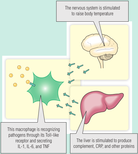 在感染过程中,巨噬细胞和其他先天免疫系统细胞会分泌其他细胞因子,例如IL-1,IL-6和TNF。这些细胞因子可激活特异性免疫系统并引起急性期反应(见Box 20.1)。