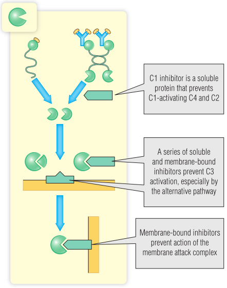 补体倾向于自发激活,特别是通过旁路途径发挥作用的时候。过度的补体激活是不可取的,因为它会导致炎症和广泛的细胞死亡。为了防止无意中激活补体,就有了补体抑制因子的存在。它们的活动范围如Fig 20.10所示。