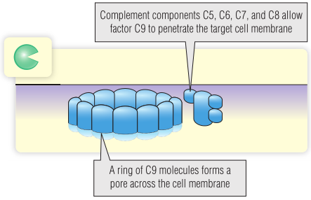 活化的C3激活补体组分C5至C9的级联反应,最终会产生MAC。C5和C6具有酶活性,可使组分C7,C8和C9嵌入靶细胞的质膜。一组10至16个C9分子即可形成一个环,该环在质膜上可形成孔(Fig 20.8)。这种孔可允许水和溶质自由通过膜,杀死细胞。MAC可直接攻击病原体,但在人类中似乎仅对防御奈瑟菌起到比较重要的作用(见Box 20.2)。Fig 20.9总结了补体如何参与细菌感染的反应。