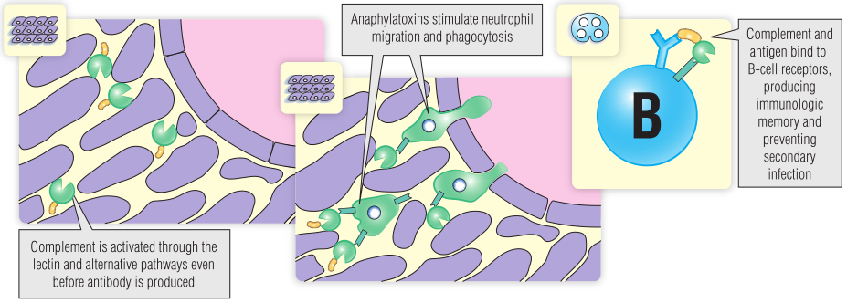 免疫复合物清除。免疫复合物是抗原与抗体结合形成的不溶性物质,可以在组织或血液中形成。这些复合物会触发炎症,如果不及时清除它们,就会发生免疫复合物引起的疾病(第30章)。补体可通过两种方式帮助去除免疫复合物: