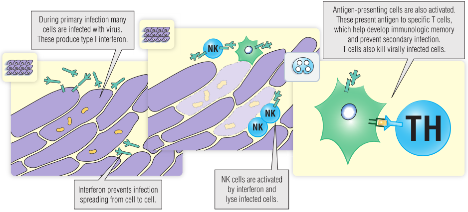 在病毒感染的数小时内,I 型干扰素会被诱导分泌并抑制病毒复制,促使NK细胞破坏被感染的细胞。尽管IFN改善了MHC I上的抗原呈递,但初始T细胞和抗体反应可能需要长达一周的时间才能发展起来。因此,干扰素的快速反应,可在启动适应性免疫反应前发挥抗感染的作用。