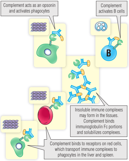 大型的不溶性复合物难以从组织中去除。大量活化的C3可破坏免疫复合物的骨架,使其溶解。溶解的免疫复合物中存在的C4和C3可以与红细胞上的补体受体CR1结合,从而将免疫复合物转运至富含吞噬细胞的器官,例如肝脏和脾脏。这些吞噬细胞可利用自身的补体和Fc受体,从红细胞中清除免疫复合物,然后吞噬并破坏免疫复合物。在此过程中红细胞不会受到伤害。