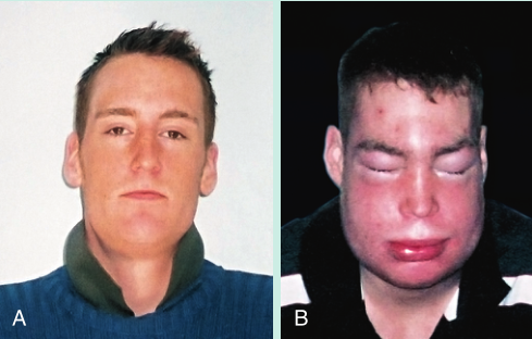 Fig 20.15  病人正常外观,以及他在血管性水肿发作期间的样子