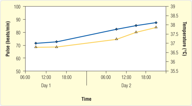 Fig 20.11 这张图表显示了病人的生命体征。蓝色菱形代表脉搏,黄色三角形代表温度。