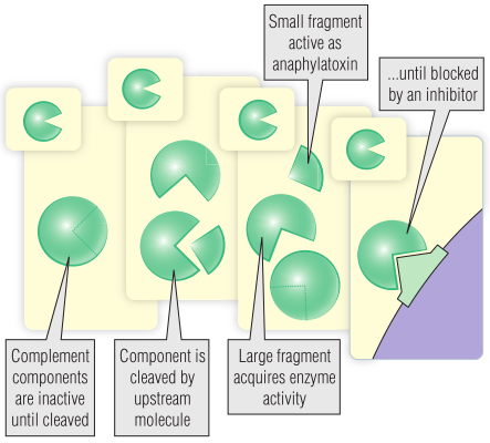 每种补体成分始终存在于血液中,一旦激活,便能够激活多个下游成分。补体激活剂对少量刺激物(例如很少的细菌)也较为敏感,随后的扩增步骤可确保产生强烈的反应,但通常是局部反应。这是通过整个补体级联:C2,C3,C4,C5和C6的补体级联反应获得的。这些分子被裂解成小片段和大片段而被激活(Fig 20.5)。大片段本身可能成为酶,并且可以裂解并激活级联中的下一个分子。这些片段也可以与抑制扩增步骤的抑制剂相互作用。