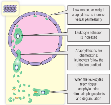 补体组分C3和C5的活化可产生小片段C3a和C5a。由于它们的分子量比较低,因此这些肽可从补体激活部位扩散开来,并产生如Fig 20.6所示的效果。低分子量的C2a肽裂解后可以产生小激肽,可使内皮细胞显著收缩,从而增加血管通透性。
