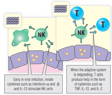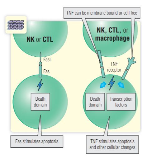 NK细胞使用的细胞毒机制与CTL使用的相同。这两种细胞都通过穿孔素/颗粒酶、Fas配体(FasL)、或分泌TNF诱导细胞程序性死亡(凋亡)。NK细胞和CTL还可分泌免疫调节细胞因子,如干扰素-γ,它能促进Th1炎症反应,激活适应性免疫系统。