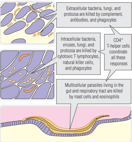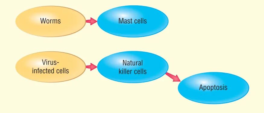 免疫系统能够消灭各种各样的病原体。Table21.1描述了补体和吞噬细胞消灭细胞外病原体的过程。免疫系统可利用上图所示的机制,通过肥大细胞和自然杀伤(NK)细胞消灭寄生虫和病毒这两种特殊类型的病原体。本章更加详细地描述了细胞凋亡这一免疫系统通用的杀伤机制。