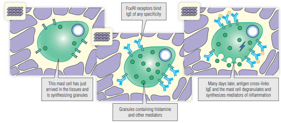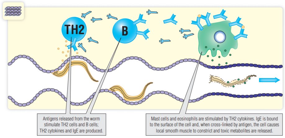 肥大细胞存在于许多寄生虫感染的组织中。尽管肥大细胞的激活依赖于预先形成的IgE抗体,但它们对抗原刺激的反应非常迅速。组胺、蛋白水解酶和前列腺素引起即时反应,包括平滑肌收缩、血管通透性增加和粘液分泌。细胞因子和白三烯促进对抗原的晚期反应,期间嗜酸性粒细胞和TH2细胞大量涌入。这种晚期炎症可能会转为慢性炎症,但与肉芽肿不同,肉芽肿的特征是巨噬细胞和TH1细胞的存在。