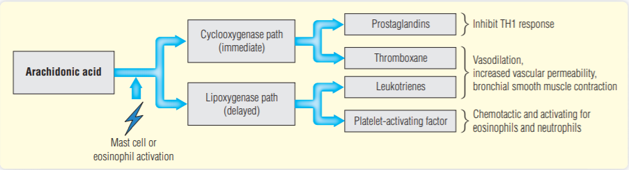 1.环氧合酶途径产生前列腺素。它们可在几秒钟内起作用,刺激血管扩张,增加血管通透性,并收缩肠和支气管的平滑肌。前列腺素还有其他较慢的作用,例如抑制TH1细胞。