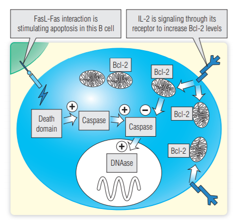 Fig22.12 这种B细胞是否发生凋亡取决于Fas、caspases、白细胞介素2(IL-2)和Bcl-2信号之间的平衡