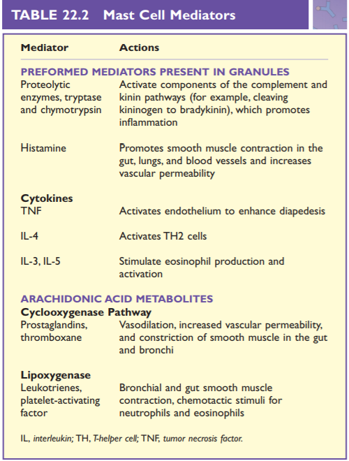 肥大细胞颗粒含有许多蛋白水解酶,包括类胰蛋白酶和胰凝乳蛋白酶。这些酶可增加支气管中的粘液分泌和平滑肌收缩。此外,它们还可裂解和激活补体以及激肽途径的组成部分,从而促进炎症。血中肥大细胞类胰蛋白酶水平可用于严重过敏反应的诊断(Box22.1)。