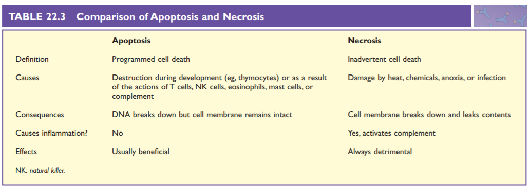 细胞凋亡是细胞程序性死亡的过程,这是一种生理性死亡。凋亡细胞可被吞噬细胞识别,吞噬细胞通常在不激发炎症的情况下清除细胞残留物。相比之下,坏死是细胞的意外死亡,通常是由于新陈代谢出现问题,如缺氧或毒素引起。坏死不会导致DNA片段化,因为它激活补体级联反应,所以通常会导致炎症反应(Table22.3)。