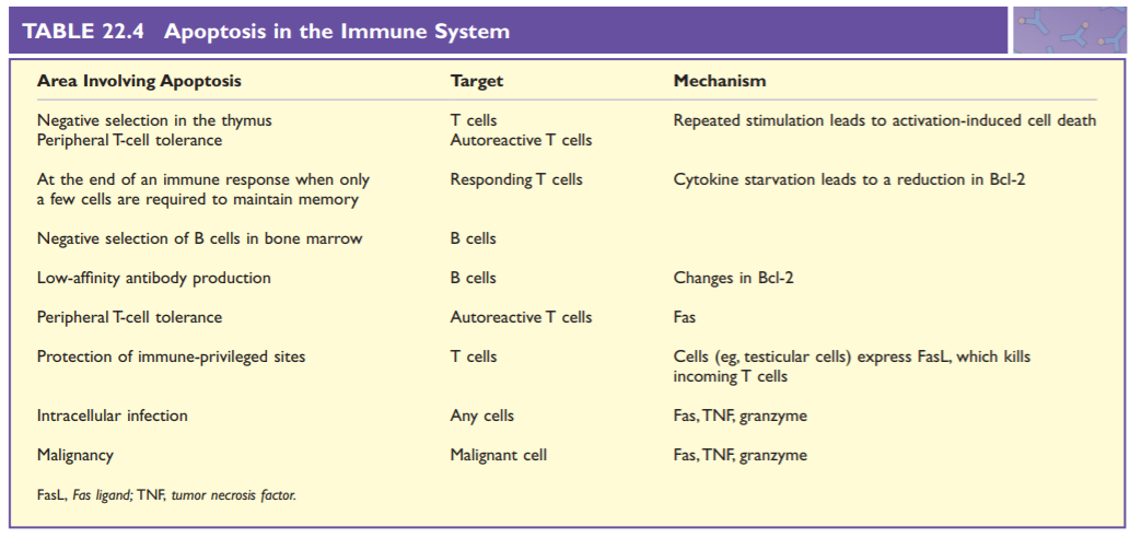 细胞凋亡在形成适应性免疫系统中起着非常重要的作用。自身反应性T和B细胞在胸腺和骨髓中生成后不久就会发生凋亡(防止自身免疫病的发生)。此外,在对病原体产生免疫反应后,多余的淋巴细胞也会通过凋亡被清除。其中每一种都使用不同的凋亡触发机制,但结果是形成了免疫反应的特异性(Table22.4)。