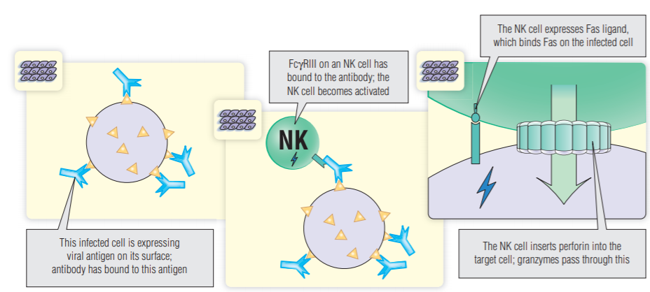 NK细胞也表达一些激活性受体。在NK细胞中,一种特殊的Fc受体,FcγRIII,可识别感染细胞表面的与Ig G结合的病毒抗原,并触发杀伤。IgG介导的NK杀伤被称为抗体依赖的细胞介导的细胞毒作用(ADCC),如Fig22.9所示。一些巨噬细胞也表达FcγRIII,在这种情况下,免疫球蛋白IgG起调理作用,触发吞噬作用。