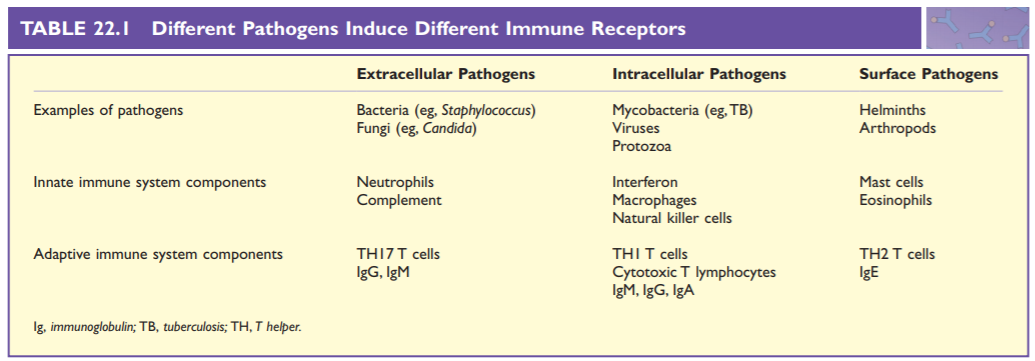 寄生虫是人类进化过程的一个重要威胁。由于卫生条件的改善,对于发达国家的人们来说这不再是一个严重的问题,但世界上仍有三分之一的人口面临寄生虫问题的威胁。寄生虫有各种各样的形状和大小(从1毫米到10m),并且生命周期比较复杂,包括卵,幼虫和成虫三个阶段。虫卵能抵御胃中的低pH值以及蛋白质的分解消化,直到到达下肠道它们才会孵化。下部肠道为成虫提供了保护,使其免受许多免疫反应成分的影响。为克服这个问题,肥大细胞和嗜酸性粒细胞已经进化为能够对生活在肠道中的蠕虫产生反应(Fig 22.1)。这些细胞被激活后可将有毒物质排放至肠腔中,增加粘液分泌,引起平滑肌收缩,从而驱除蠕虫。Fig22.2总结了这些反应。呼吸道中也进化出了相同的机制。