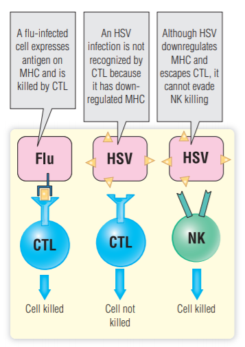 Fig22.10 左边的自然杀伤(NK)细胞不会杀死被感染的细胞,因为它仍然表达主要组织相容性复合体(MHC),右边被感染的细胞已经停止表达MHC,将会被杀死