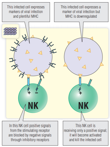 刺激信号和抑制信号之间的平衡决定了NK细胞活化的结果,NK优先杀伤不表达MHC的细胞。细胞可能因为病毒感染或癌细胞突变而缺乏MHC的表达,这两个过程都能使异常细胞逃脱CTL的杀伤。NK细胞通过杀死缺乏MHC表达的细胞来克服免疫反应中的这一潜在缺陷。当干扰素γ(IFN-γ)存在时,这种类型的杀伤尤其重要;细胞因子最大限度地提高了正常细胞的MHC表达,同时也增强了NK细胞的活性。MHC表达减少起危险信号的作用,提醒NK细胞注意感染的存在。
